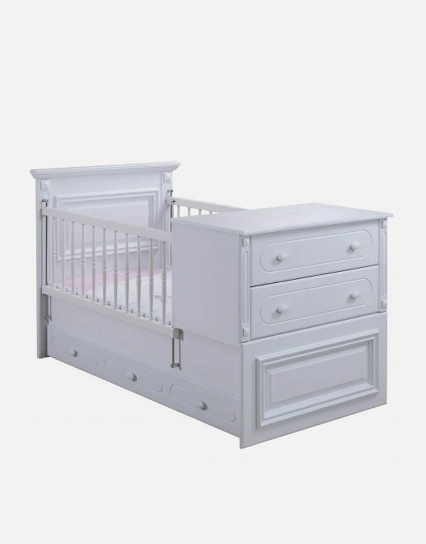 تخت دو منظوره به گونه ای طراحی شده است که دارای یک صفحه تعویض نوزاد می باشند که بعد از رشد کودک می توان صفحه تعویض را به راحتی از روی تخت جدا نمود . با جدا سازی صفحه تعویض شما یک تخت با طول بلند تر به همراه پا تختی خواهید داشت .(تشک به کار رفته در این تخت 75*160 می باشد)