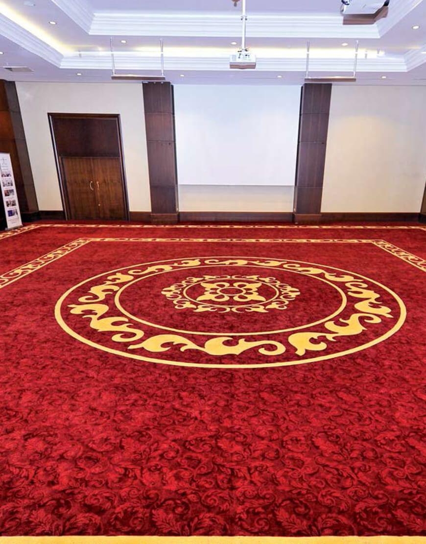 موکت با زمینه قرمز و طرح متمرکز و حاشیه به رنگ زرد مناسب برای فضای لابی محل مصرف : هتل ، بیمارستان ، سینما و رستوران با تراکم : ۹۰۰