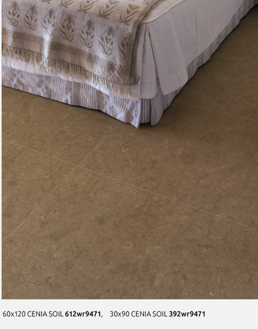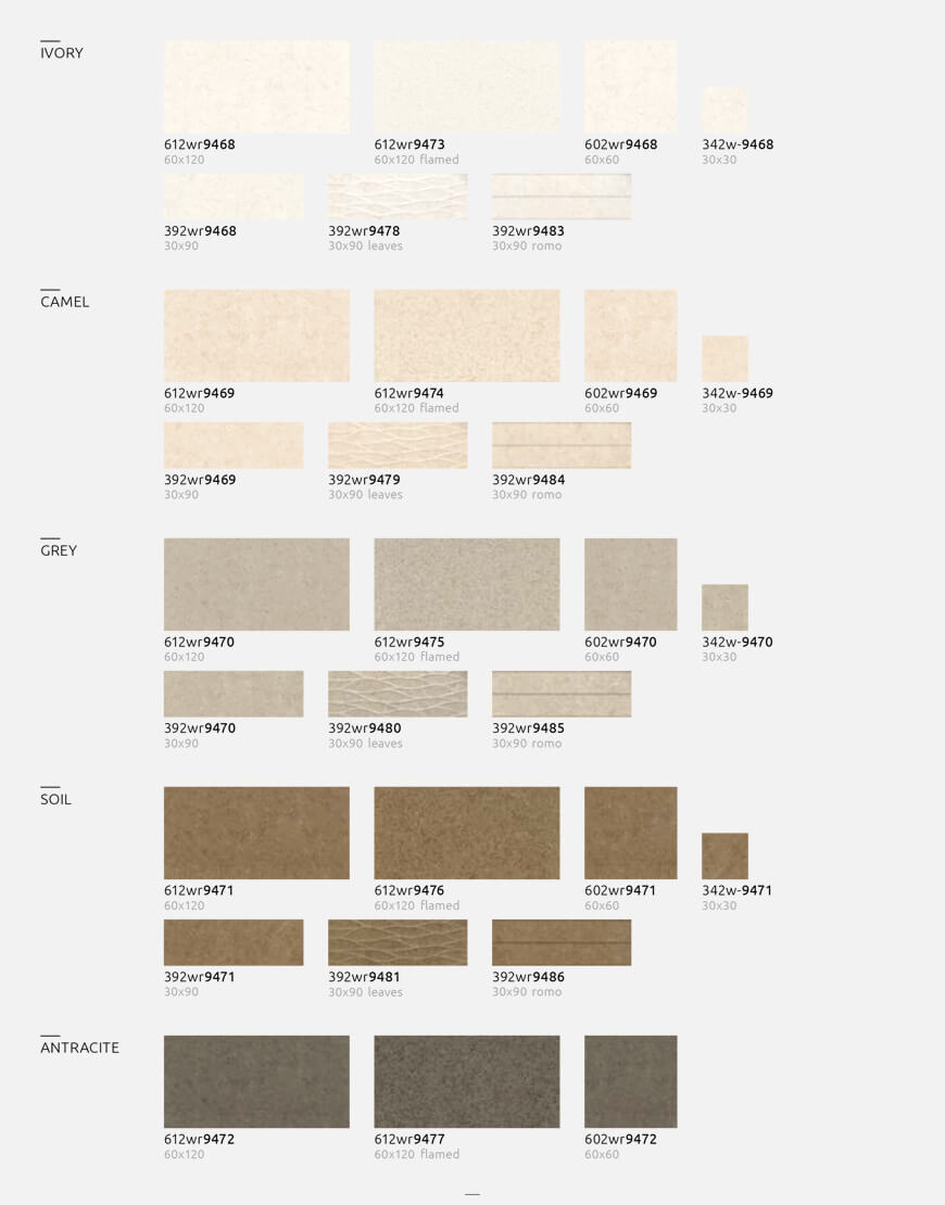 and brushed stone, characterized by a soft and silky feel. Cenia is available in five different tones that range from the lightest Ivory, through the intermediate colours Camel and Grey, an elegant brown shade called Soil and Antracite, the darkest one. The last one found only in 60×120 centimetres and 60×60 centimetres while the other hues are also available in 30×90 centimetres with its corresponding decorative designs, and all of them accompained by the 30×30 centimetres size. To finally complete the collection there is a finishing ideal for façades, Flamed, that stands out for the nature of its structured surface.