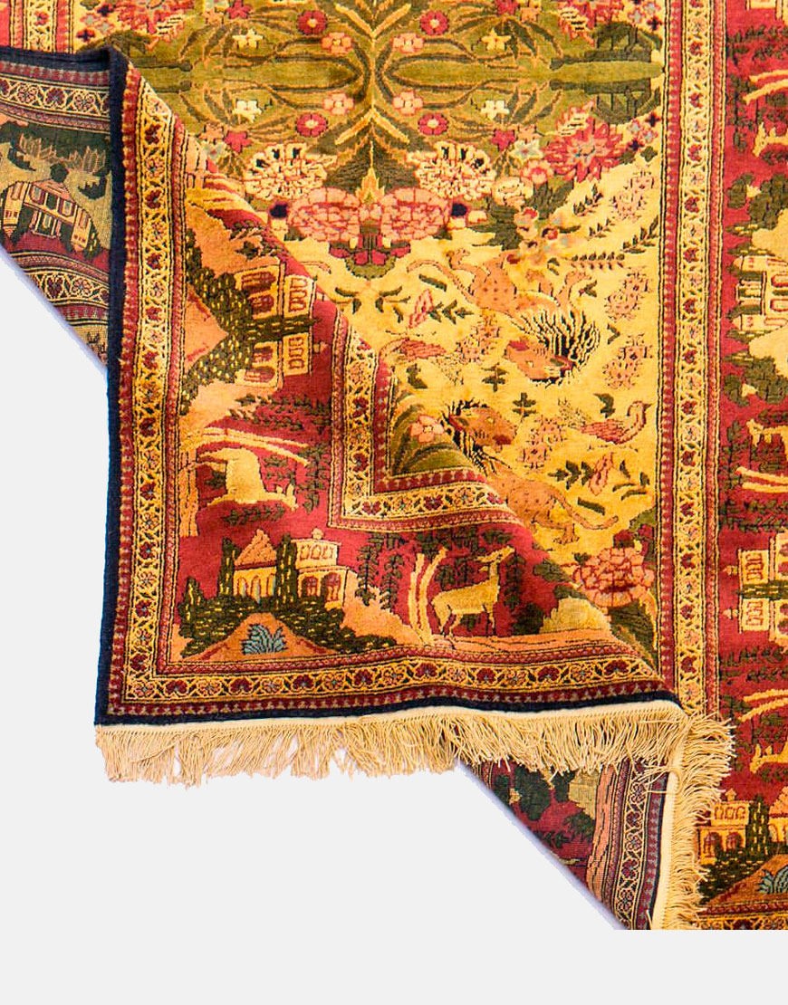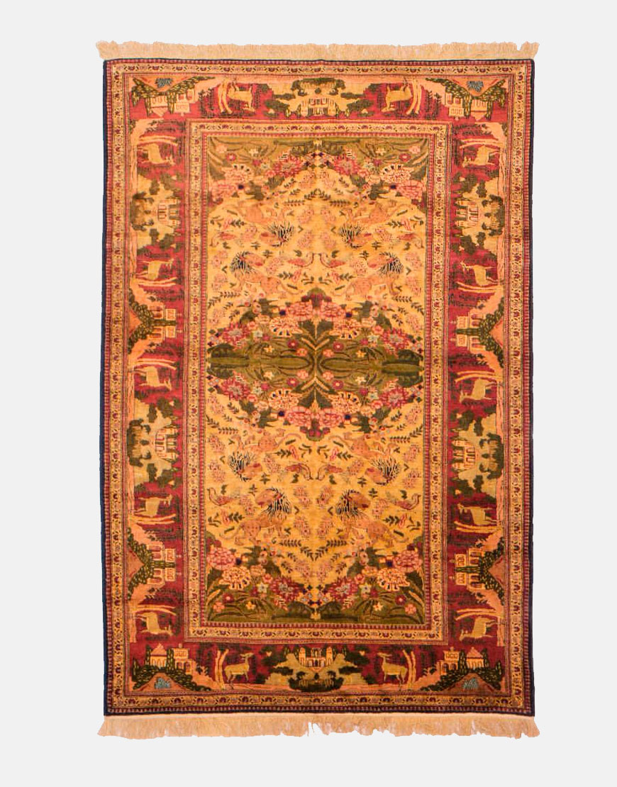 استفاده از طرح کلاسیک شکارگاه ،جنس چله از ابریشم میباشد . دارای طول و عرض ۱۰۵*۱۶۳ سانتی متر .با رنگ زمینه ی کرم و قهوه ای رنگ است ،که جنس پرز از ابریشم و پشم میباشد . با وزن تقریبی ۳٫۵ کیلوگرم و ضخامت ۵ میلیمتر ، این فرش توسط بافنده های خراسان تهیه شده است . این طرح برای استفاده در فضاهایی با طراحی و سبک کلاسیک مناسب میباشد .