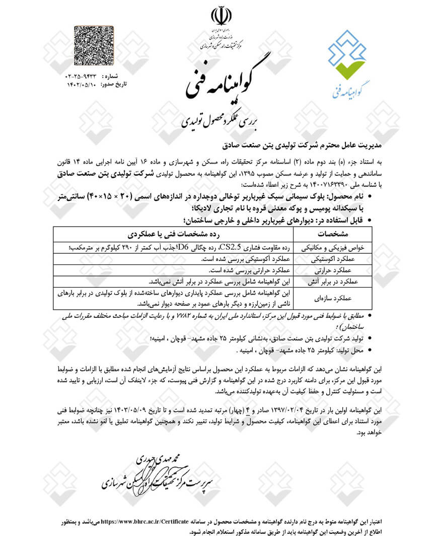 استانداردها | استاندارد ملی 7782 ایران, گواهینامه فنی از مرکز تحقیقات راه، مسکن و شهرسازی |
