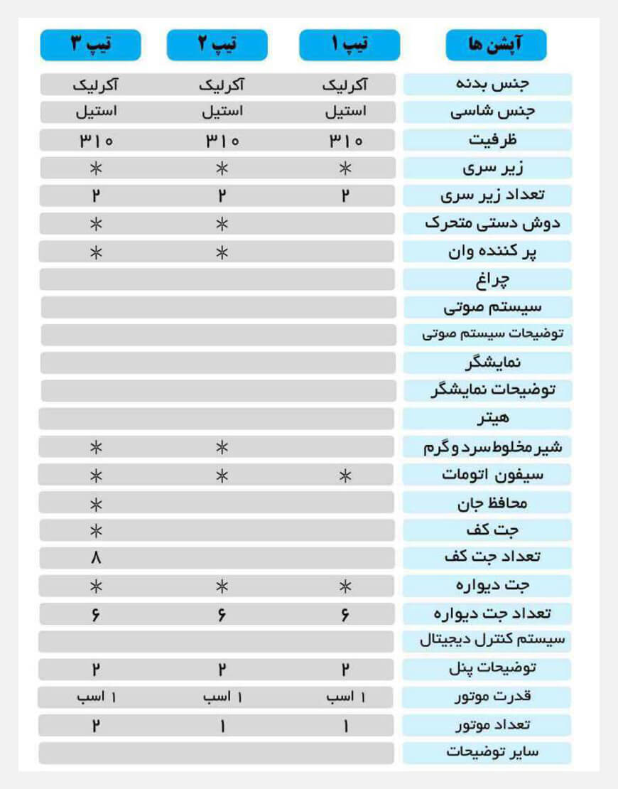 | تیپ | جکوزی تیپ1 : جکوزی ، پانل بزرگ ، پانل کوچک, جکوزی تیپ2 : جکوزی ، پانل بزرگ ، پانل کوچک ، شیرآلات, جکوزی تیپ3 : جکوزی ، پانل بزرگ ، پانل کوچک ، شیرآلات ، بلوئر و موتور بلوئر, وان : شاسی تمام استیل، پانل بزرگ، سیفون پدالی |