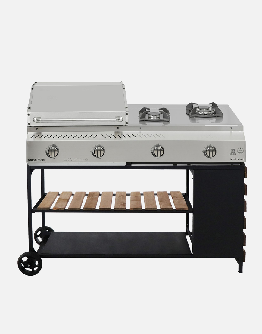 کباب پز استفاده شده در این باربیکیو یک کباب پز استیل ۵۵ سانتی است که دارای ۸ شعله است. این کباب پز دارای ورودی گاز مجزا با اجاق خوراک پزی است. هر شعله سرشعلهای مجزا از جنس استیل دارد. دو عدد ولوم کنترل حرارت دارد که میتوان حرارت شعله ها را تنظیم کرد. زیر کباب پز سینی چگه گیر قرار دارد. این محصول دارای یک درب استیل دو تکه است که می توان به حالت درب بسته نیز از باربیکیو استفاده کرد.