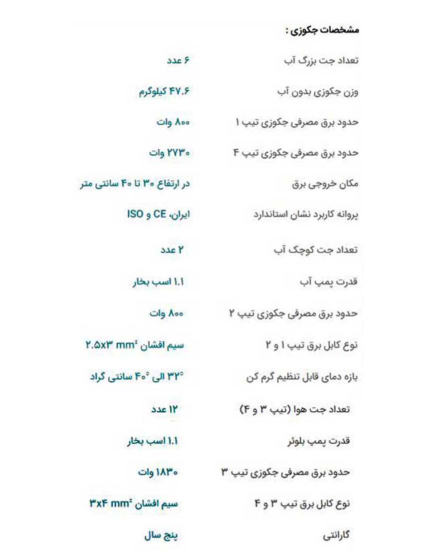 | تیپ | تیپ1: جکوزی با شاسی و پانل جلو, تیپ2: جکوزی با شاسی، پانل جلو و روشنایی, تیپ3: جکوزی با شاسی، پانل جلو، روشنایی و ماساژور کف(بلوئر), تیپ4: جکوزی با شاسی، پانل جلو، روشنایی، بلوئر، هیتر، نمایشگر دما و ساعت |