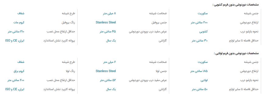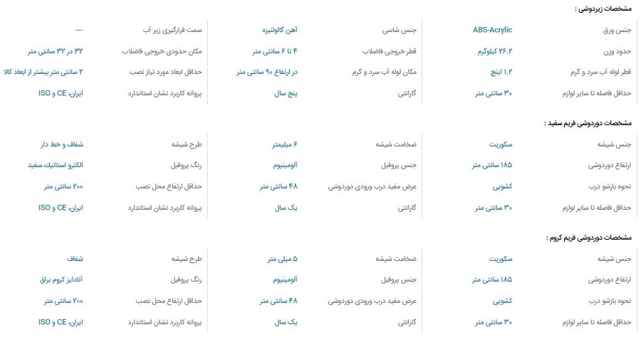 | تیپ | زیردوشی+دوردوشی بدون فریم (کشویی), زیردوشی+دوردوشی بدون فریم (لولایی), زیردوشی+دوردوشی فریم سفید, زیردوشی+دوردوشی فریم کروم, فقط زیردوشی |