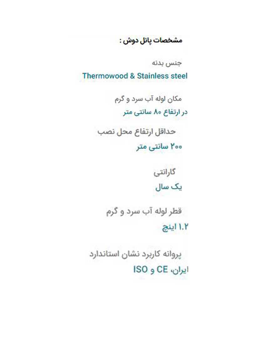جنس بدنه این پانل از Thermowood & Stainless steel ساخته شده است. حداقل ارتفاع برای محل نصب 200 سانتی متر می باشد. . قطر لوله آب سرد و گرم 1. 2 اینچ که در ارتفاع 80 سانتی متری قرار دارد. این محصول دارای یک سال گارانتی و پروانه کاربرد نشان ایران،CE وISO می باشد.