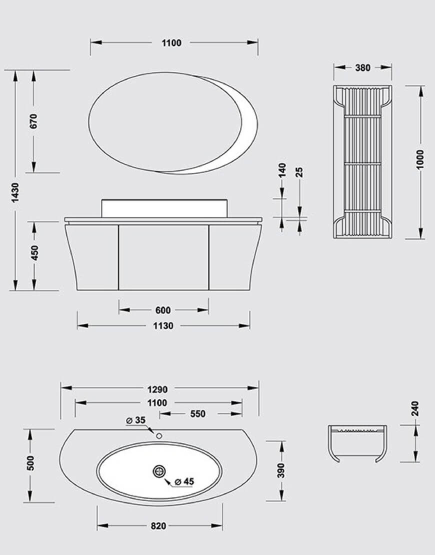 ابعاد (طول*عرض*ارتفاع) | کابین زیر روشویی(128*48*58سانتیمتر)- صفحه روشویی(130*50 سانتیمتر)- کاسه روشویی(82*39*14 سانتیمتر)- آینه(110*67سانتیمتر)- قفسه دیواری(100*38*24سانتیمتر) |