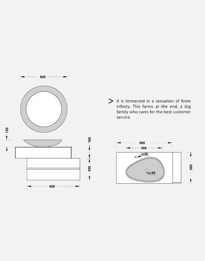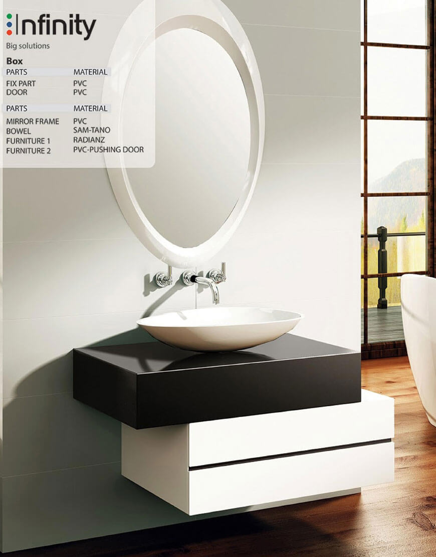 درباره شرکت: شرکت سام سنگان طرح نو با هدف ارائه محصولات لوکس ساختمانی-بهداشتی و دکوراتیو به همراه استفاده از مصالح کیفی مدرن و همچنین استفاده از سنگ های مصنوعی در صنعت ساختمان در سال ۱۳۸۷ تأسیس شد و در سالهای اخیر با اجرای پروژه های متعدد ، موفق به همکاری مؤثر با طیف وسیعی از سازندگان عرصه ساختمان ، انبوه سازان ، معماران و فروشگاههای بخش لوازم بهداشتی گردیده است. مشخصات محصول: روشویی کابینتی Infinity مجموعه ای از آینه ، کابین زیر روشویی است. جنس ورق کابینت و باکس از ورق پی وی سی می باشد.