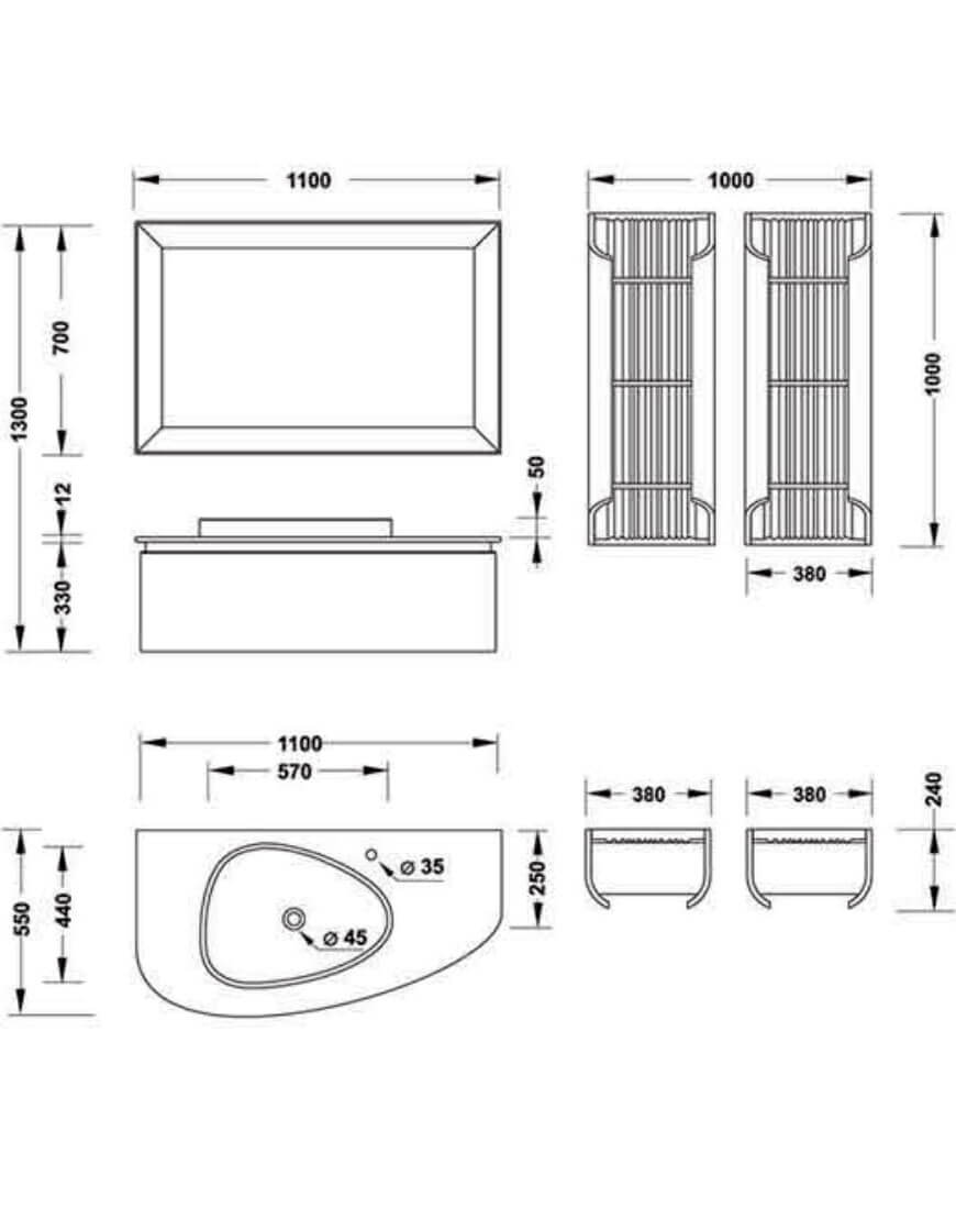 ابعاد (طول*عرض*ارتفاع) | کابین روشویی(110*55*33سانتیمتر)- آینه(110*70سانتیمتر)- قفسه ثابت دیواری(100*38*24سانتیمتر) |