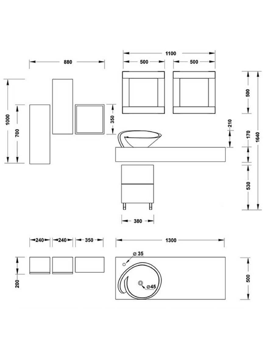 ابعاد (طول*عرض*ارتفاع) | کابین زیر روشویی(48*45*40سانتیمتر)، صفحه روشویی(130*50*17سانتیمتر)، کاسه روشویی(45*21سانتیمتر)، آینه(100*50سانتیمتر)، قفسه دیواری(70*24سانتیمتر،35*35سانتیمتر) |