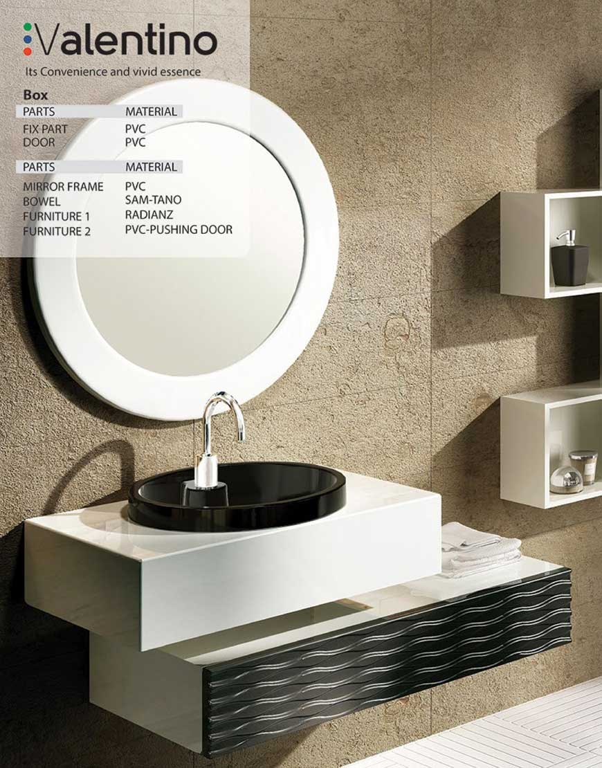 درباره شرکت: شرکت سام سنگان طرح نو با هدف ارائه محصولات لوکس ساختمانی-بهداشتی و دکوراتیو به همراه استفاده از مصالح کیفی مدرن و همچنین استفاده از سنگ های مصنوعی در صنعت ساختمان در سال ۱۳۸۷ تأسیس شد و در سالهای اخیر با اجرای پروژه های متعدد ، موفق به همکاری مؤثر با طیف وسیعی از سازندگان عرصه ساختمان ، انبوه سازان ، معماران و فروشگاههای بخش لوازم بهداشتی گردیده است. مشخصات محصول: روشویی کابینتی Valentino مجموعه ای از آینه ، کابین زیر روشویی و قفسه ثابت دیواری است. جنس ورق کابینت و باکس از ورق پی وی سی می باشد.