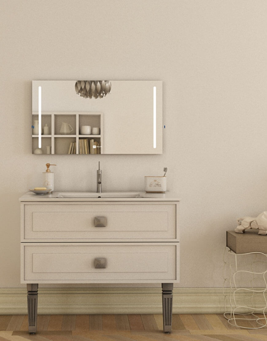 ابعاد (طول*عرض*ارتفاع) | کابینت: 86.4*44*82 سانتیمتر | آینه:80*50*3.6 سانتیمتر | سینک دستشویی: 88*47*15 سانتیمتر |